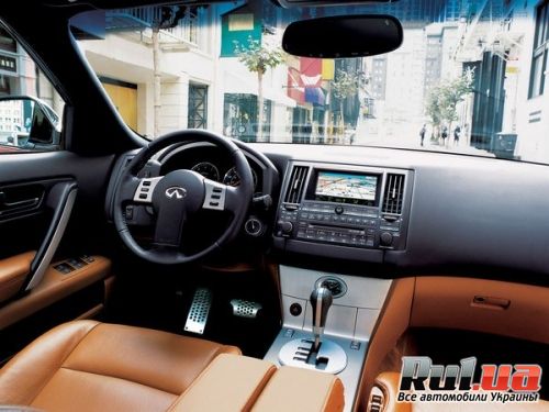 Черная кожа, эргономичные и просто красивые сиденья, глубокая посадка. А также узкие окошки, толстые стойки, высокий и массивный тоннель, по-спортивному маленький руль, алюминий в отделке, на рычаге АКПП и педалях. Салон Инфинити FX дарит ощущение тщательно продуманной функциональности и роскоши. Центральную консоль украшают фирменные аналоговые часы с кварцевым механизмом, приборную панель - стилизованные под хронометры циферблаты, выделенные хромированными ободками.